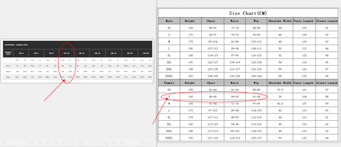 You can check if there is a size chart for your garment on the last sheet of the product chart. If there is a size chart at the end of the image, please refer to it to choose the correct size. For example: