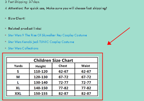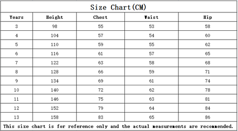 Firstly, we recommend that you measure your child's height, chest, waist and hip measurements. Then find the child's size chart for this garment on the product details page or on the last page of the garment display image as shown above. After carefully checking the measurements, choose the closest size.